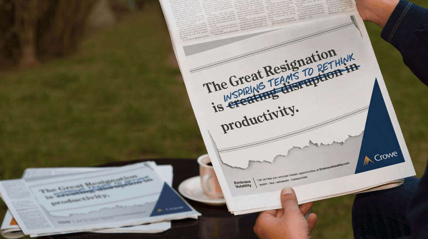 We developed the "Embrace Volatility" movement based on the idea that, with Crowe as your partner, your business can benefit from volatility rather than be its victim. This innovative approach was designed to break through the communications "sea of sameness" in the professional services sector and position Crowe as a thought leader. Key elements of the campaign included: