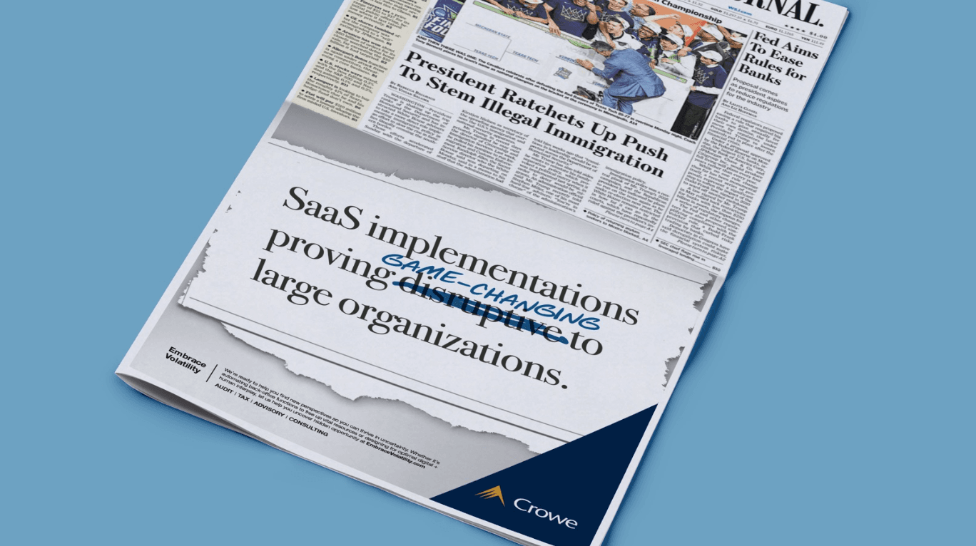 Crowe LLP, a mid-size professional services firm, faced the daunting task of establishing its brand in a risk-averse B2B market dominated by well-known competitors. Despite being a top 10 accounting/tax/audit firm, Crowe had very low brand awareness among its C-Suite target audience.